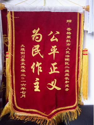 8月1日,星期一,云南迪志律师事务所律师,带着一面“公平正义、为民做主”的锦旗来到我院民二庭,他说这是他的当事人委托他送给民二庭庭长和建香的,因为当事人史茂雄人在剑川,不方便过来,委托他给和庭长送来锦旗,并表示感谢。