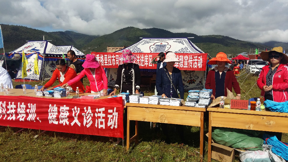 8月8日,一个吉祥的日子,迎来了小中甸镇联合村委会主办的“藏域水乡卡萨民俗文化节”,结合这一特殊的节日,香格里拉市移民开发局联合市文化局、市司法局及迪庆州老科协在小中甸水利枢纽工程库区开展了“移民为国做贡献 我为移民送服务”为主题的文化、法治、健康“三下乡”活动。