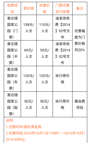 截止2016年10月1日我市各大景区门票均已按规定下降并做好公示,普达措国家公园门票全票原价138元/人次,优惠票价110元/人次;巴拉格宗景区门票原价150元/人次,优惠票价格130元/人次;蓝月山谷景区原票价40元/人次,优惠票价32元/人次;松赞林景区原票价80元/人次,优惠票价64元/人次;虎跳峡景区原票价65元/人次,优惠票价52元/人次;白水台景区原票价30元/人次,优惠票价24元/人次。各景区如未按规定进行降价,游客可拨打价格投诉电话12358进行投诉。