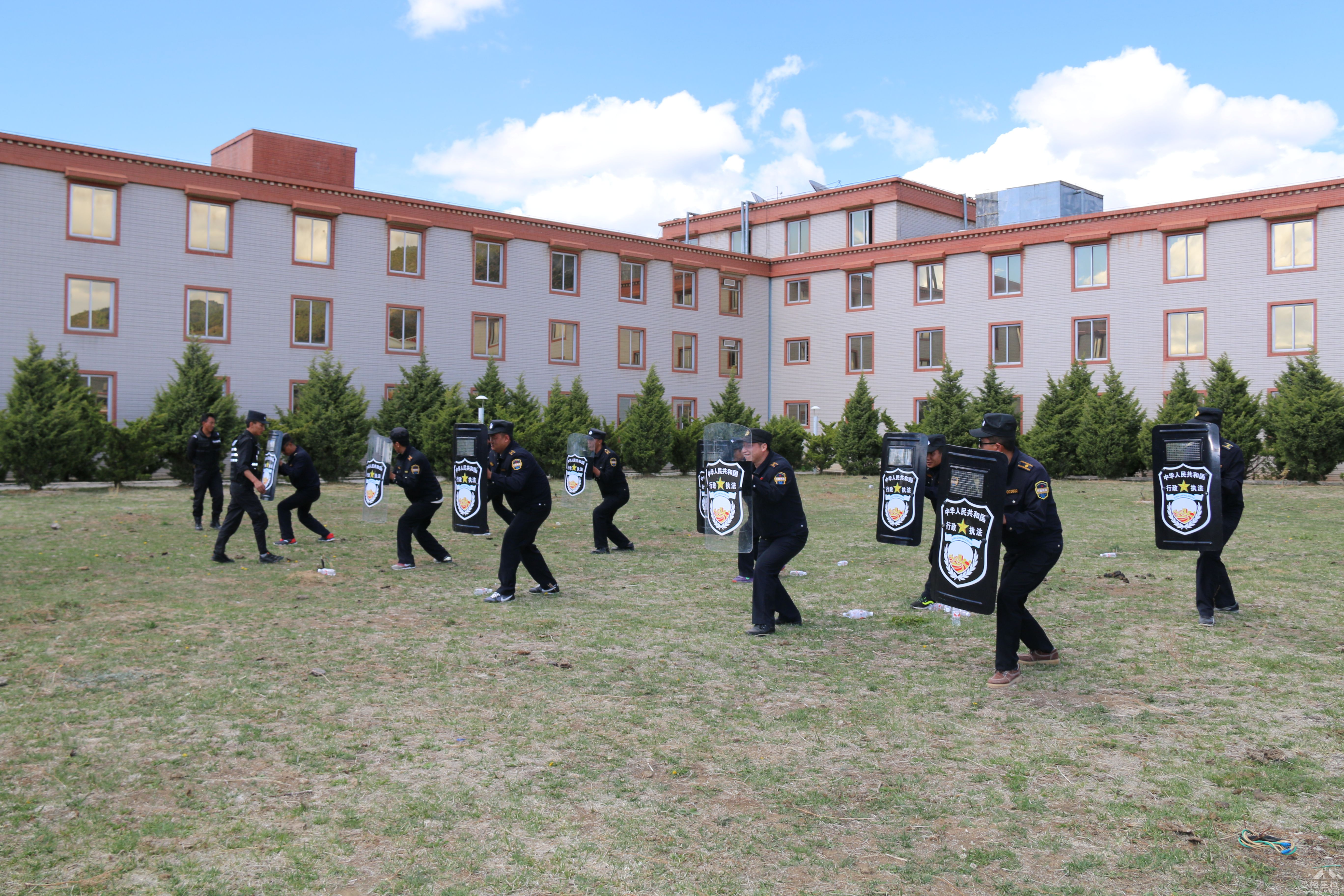 本次军训活动在各大队保证日常工作不影响的情况下采取分两批次进行,确保了全局所有执法人员全部参加训练。训练内容有队列练习、盾牌防护术、擒拿术等。