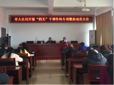 5月28日下午,根据工作安排,市人社局组织全局干部职工对召开市人社局推进“两学一做”学习教育常态化制度化暨“四无”干部作风专项整治动员大会,会议由党委书记李永珍同志主持。