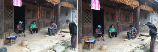 上图为工作组组长张进尚及村挂包领导周新宏在堆满一组精准扶贫户和义中家中进行入户调查及核对信息。
