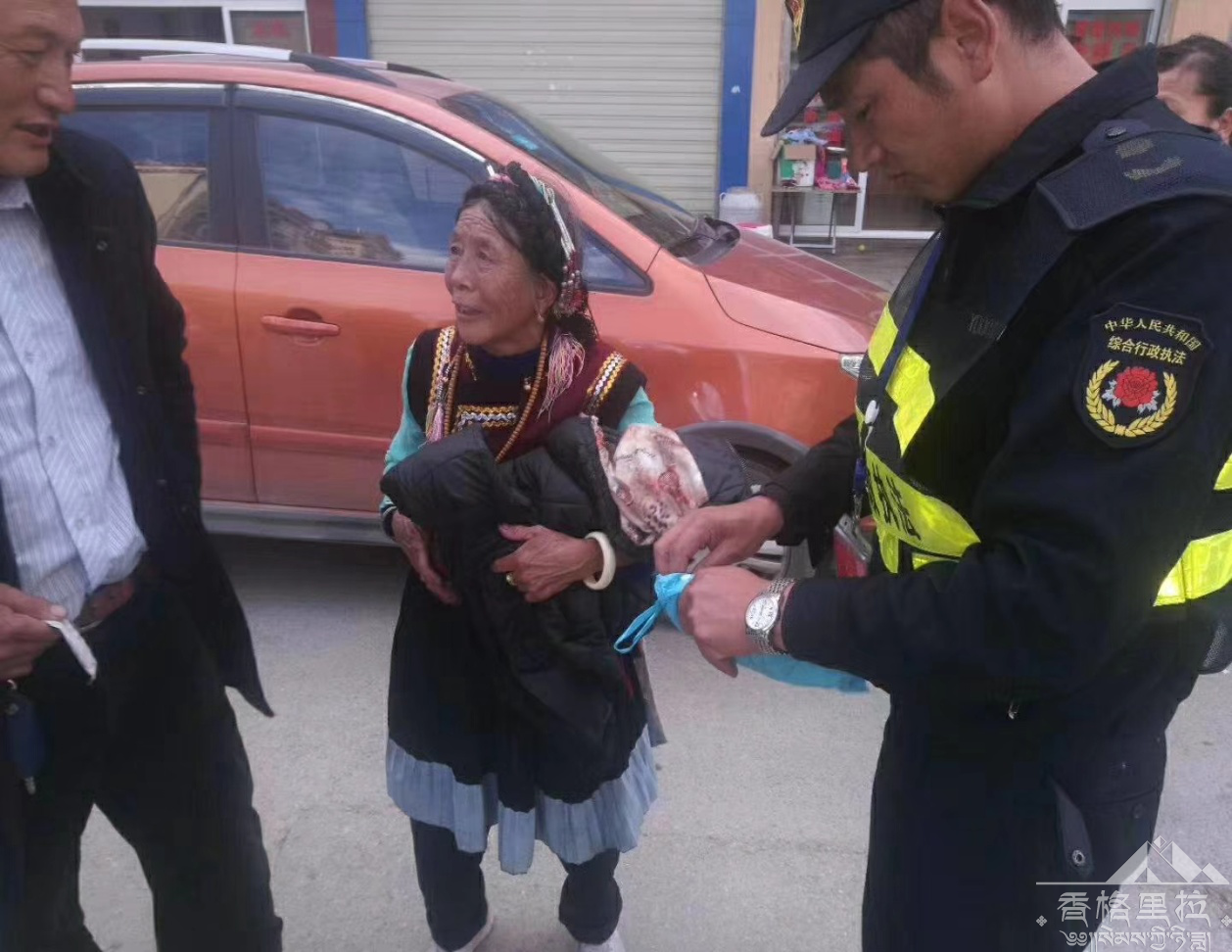 今天是我州建州60周年庆典之日,香格里拉城区显示出一片欢乐祥和的气氛。各乡镇前来参加庆典的人数增多,由于不知明的原因,今天下午17:50分我局城管执法大队一中队在上班途中,经过香巴拉小镇时无意间发现一位老人被狗追咬。我局城管执法大队一中队队员立即下车保护老人,将追咬的狗赶走,经过询问后得知老人年龄70岁以上,不懂汉语,已经在街上徘徊许久,因和家人走散身上无任何家人信息,我局城管执法大队一中队队员在附近询问后,均无任何信息,没有办法之后移交建塘派出所帮忙寻找家人。事后19点左后建塘派出所打电话告知,老人已经被家人接走。