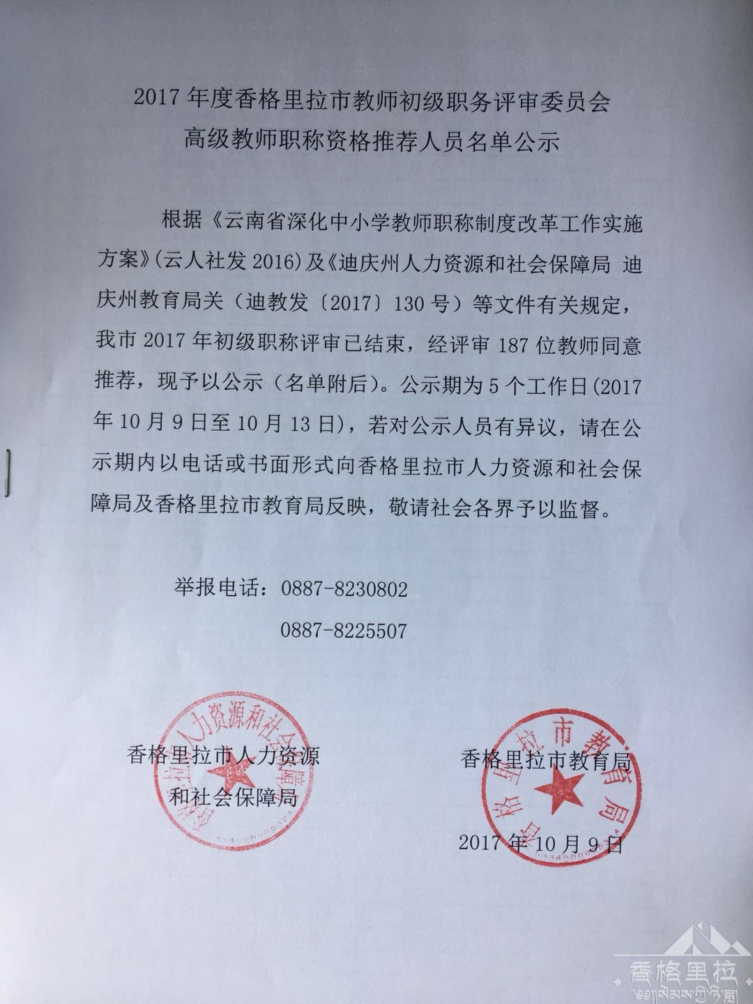 【人社局】2017年度香格里拉市二级教师职称资格评审通过人员名单公示