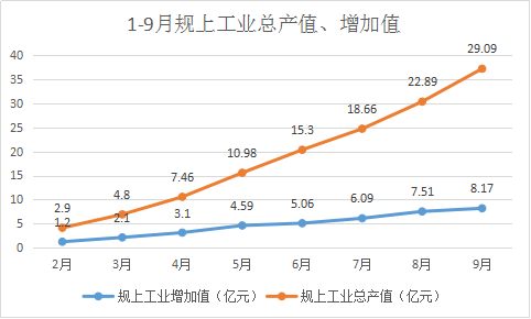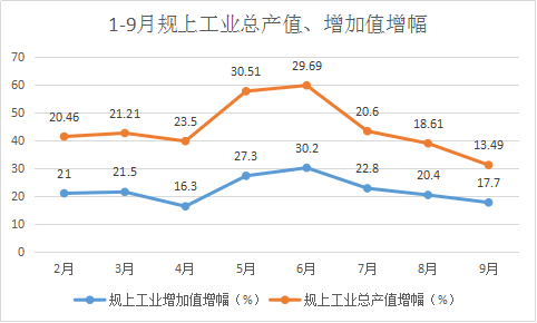 增加值增速高开稳走。初步核算全市实现工业增加值(可比价增长率)9.67亿元,累计增长16.7%。其中:规模以上工业增加值8.16亿元,累计增长17.7%;轻工业实现增加值1.5亿元,累计增长2.5%,重工业实现增加值6.65亿元,累计增长21.5%。