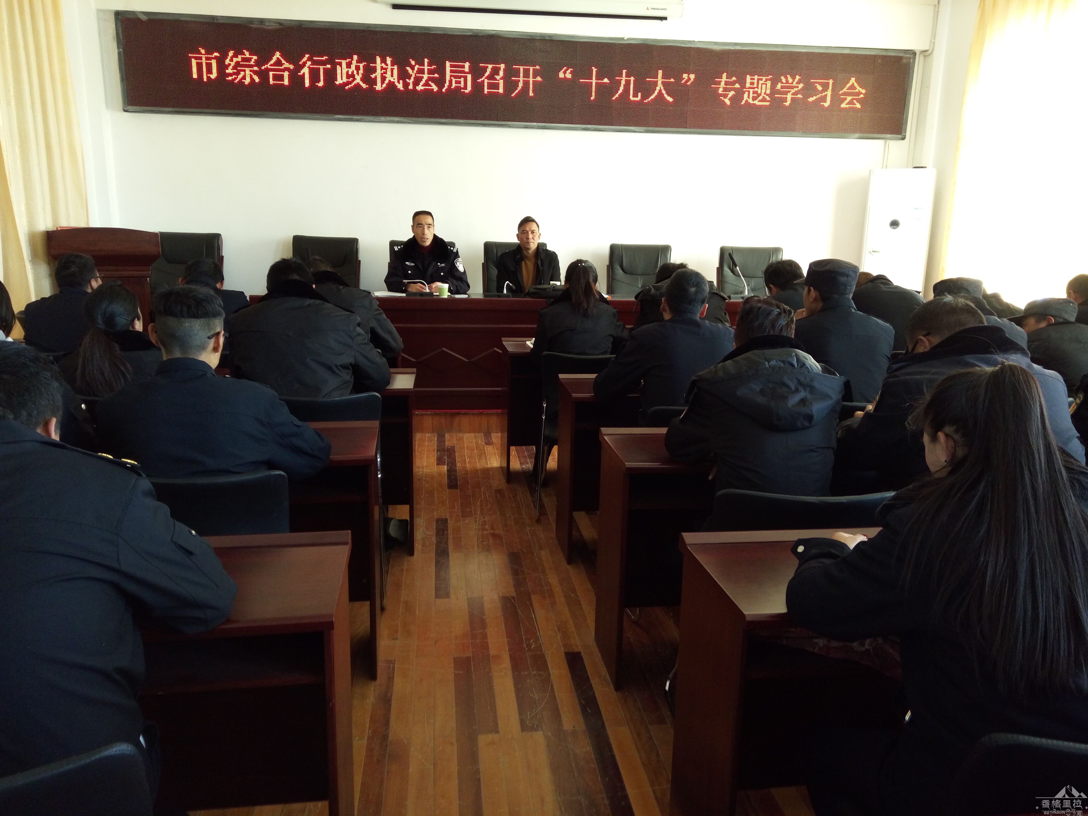 局长张阁同志在主持学习会时,要求全局职工干部要不忘初心、牢记使命,把学习贯彻党的十九大精神作为首要政治任务,进一步加强集中学习、个人自学和专题研讨,进一步结合本职工作研究贯彻落实措施,及早安排,全力以赴抓好城市管理综合执法工作,切实把学习贯彻党的十九大工作成效转化为推进开展工作的长效动力。
