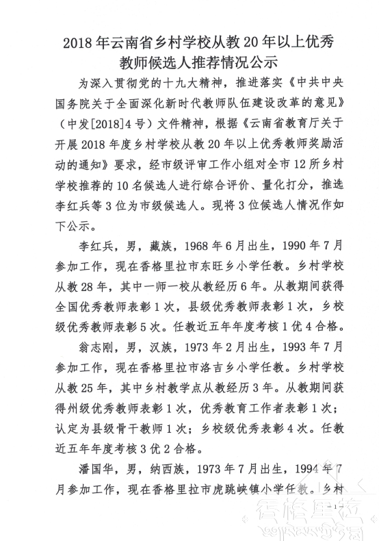 2018年云南省乡村学校从教20年以上优秀教师候选人推荐情况公示.doc