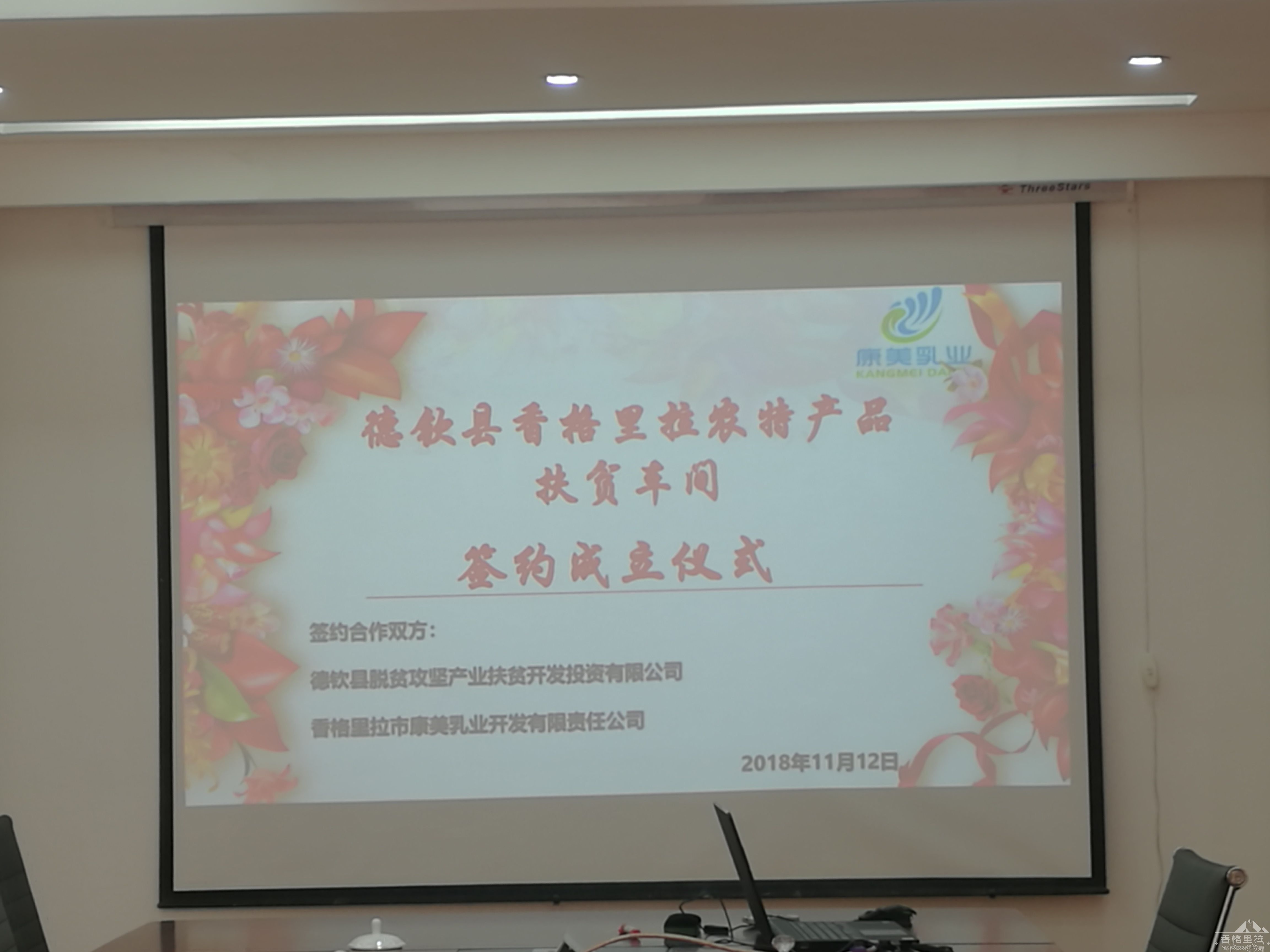 11月12日上午, 德钦县香格里拉农特产品扶贫车间签约成立仪式在香格里拉工业园区箐口特色产业片区内的龙头企业——康美乳业有限公司会议室举行,迪庆州德钦县人民政府领导一行、康美乳业有限公司股东及管理层和箐口特色产业片区管理委员会领导参加了该仪式。