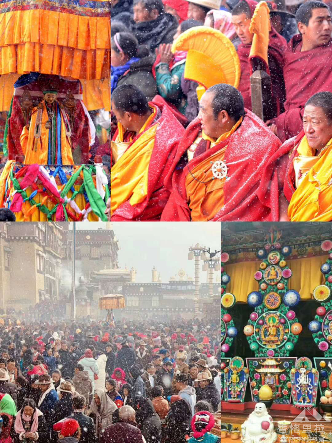 藏历正月十五,公历2019年2月19日是迎佛节,也叫晒佛节,迎接未来佛—强巴佛,噶丹·松赞林寺举行了盛大的“祈愿大法会”,藏语叫“默朗钦布大法会”,这是藏传佛教格鲁派最重要的佛事活动之一。当天凌晨4时,寺里的僧人就开始诵经,大寺天井陈列传昭法会大唐卡一副,大寺洛张一层楼高的酥油花一副,觉厦、西苏的两副法供酥油花,八个康参八副酥油花。陈列各种银制钳宝的八瑞相,八瑞物、七政宝、五妙欲等工艺品。