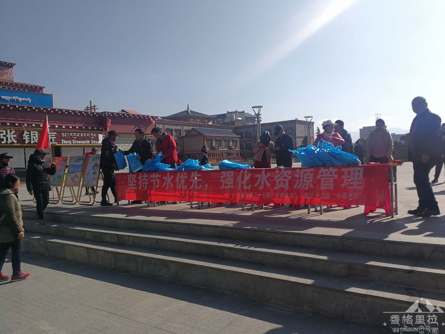 2019年3月22日上午,迪庆州水务局和香格里拉市水务局在坛城广场开展以“坚持节水优先,强化水资源管理”为主题的宣传活动。悬挂宣传条幅11条,宣传展板10块,向群众发放了防汛抗旱宣传手册300本,河长制宣传手册300本,水土保持宣传手300本,节水宣传折页600份及印有宣传主题字样的雨伞700把、和手提袋700袋。同时发放扫黑除恶知识宣传册200份。