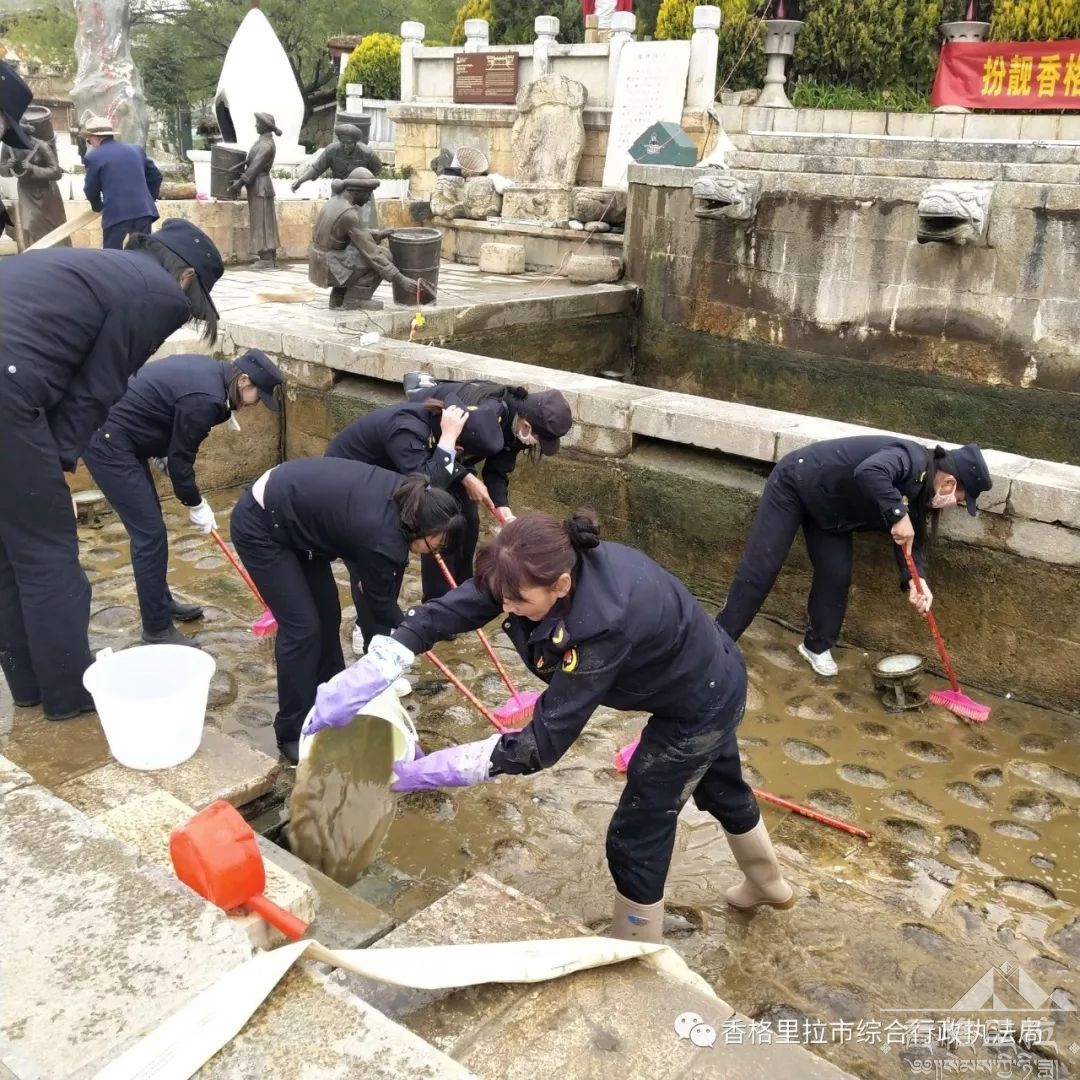 现场每一位党员都认真的清洗着水井里的淤泥和青苔,大家都知道这口水井对古城的意义、对香格里拉的意义,在游人如织的水井边,鞋子湿了、全身都是泥浆,也没有人怨言。用扫把一点一点清洗着水井里的附着物,一桶一桶的将污水提出往外倒。洗完一个水井又接着清洗下一个水井,团队的协作精神在这一刻彰显,党员不怕脏、不怕累、不怕苦的井水在这一刻体现。