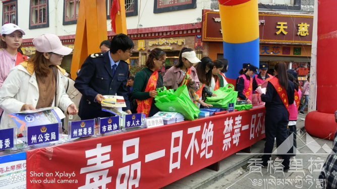 2019年6月26日,迪庆州、香格里拉市禁毒委在池慈卡街举办以“健康人生·绿色无毒”为主题的“6·26”国际禁毒日宣传活动,香格里拉市文化和旅游局作为市级禁毒委成员单位积极参与活动。
