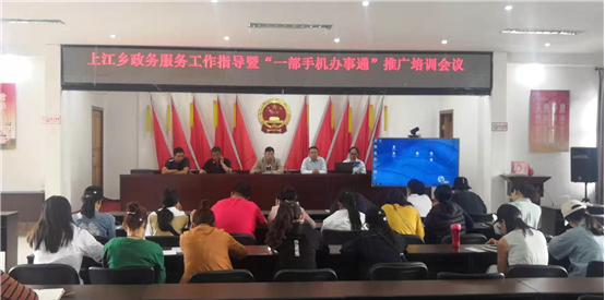 7月11日下午则在上江乡会议室召开上江乡5个行政村政务服务工作指导暨一部手机办事通推广培训会议,上江乡政府分管领导、为民服务中心工作人员、学校及医院推广员、各村总支书记等20余人参会。