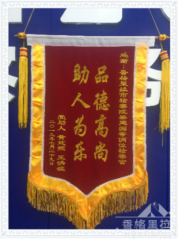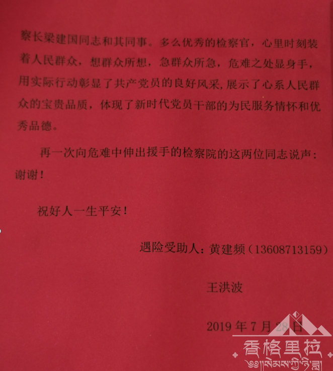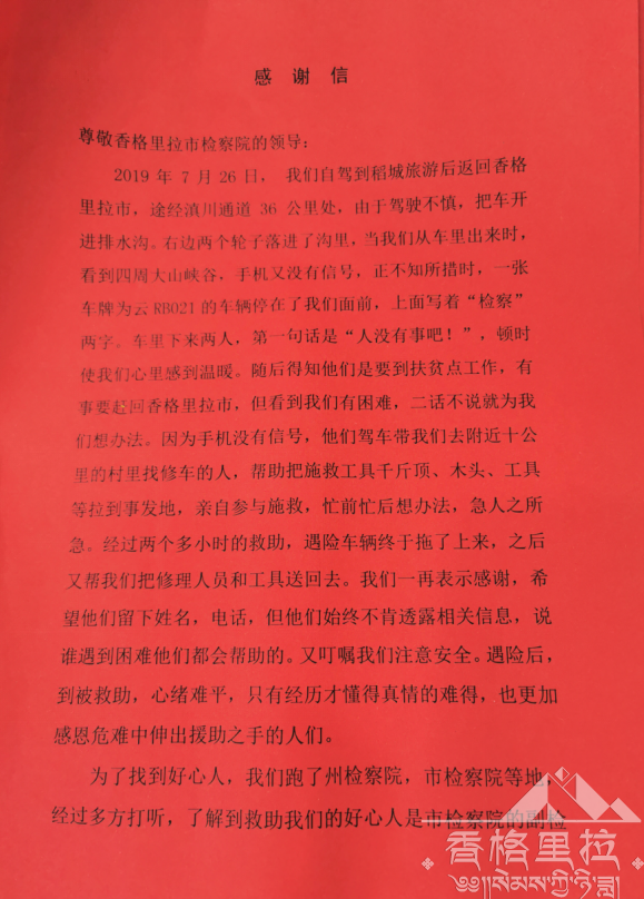 近日,在云南省香格里拉市人民检察院,两名当事人黄建频和王洪波夫妇专门托人送来一面写有“品德高尚,助人为乐”的锦旗和一封感谢信,对危难时刻救助他们的梁建国和谢正窑两名检察干警表示感谢。