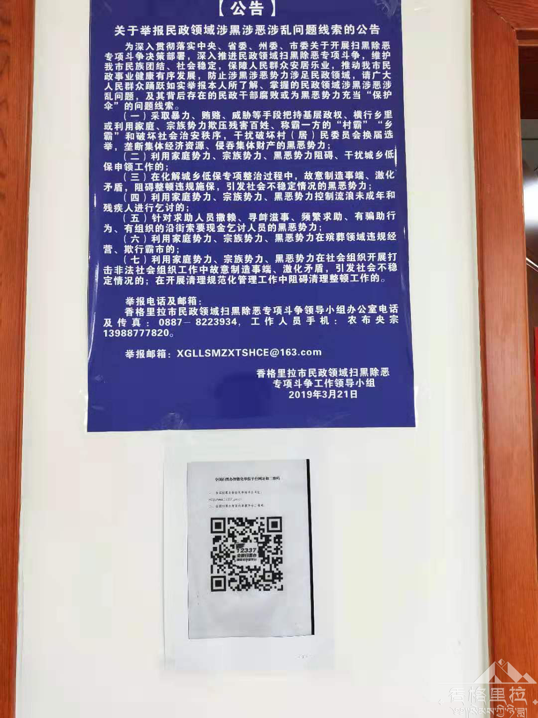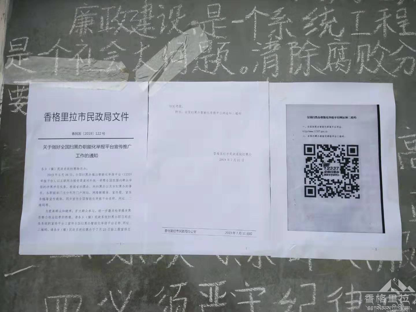 为提高群众知晓率,扩大群众参与,进一步激发检举揭发黑恶势力违法犯罪的热情,市民政系统扫黑办组织11个乡镇民政系统扫黑办、局机关下属站、馆宣传全国扫黑办智能化举报平台名称、网址和二维码宣传工作。同时转发了《迪庆州民政系统扫黑除恶专项斗争领导小组关于做好全国全国扫黑办智能化举报平台宣传推广工作的通知》(〔2019〕41号)文件,严格贯彻落实好文件精神,要求在各系统、各站馆的宣传平台上宣传全国扫黑办智能化举报平台名称、网址和二维码。