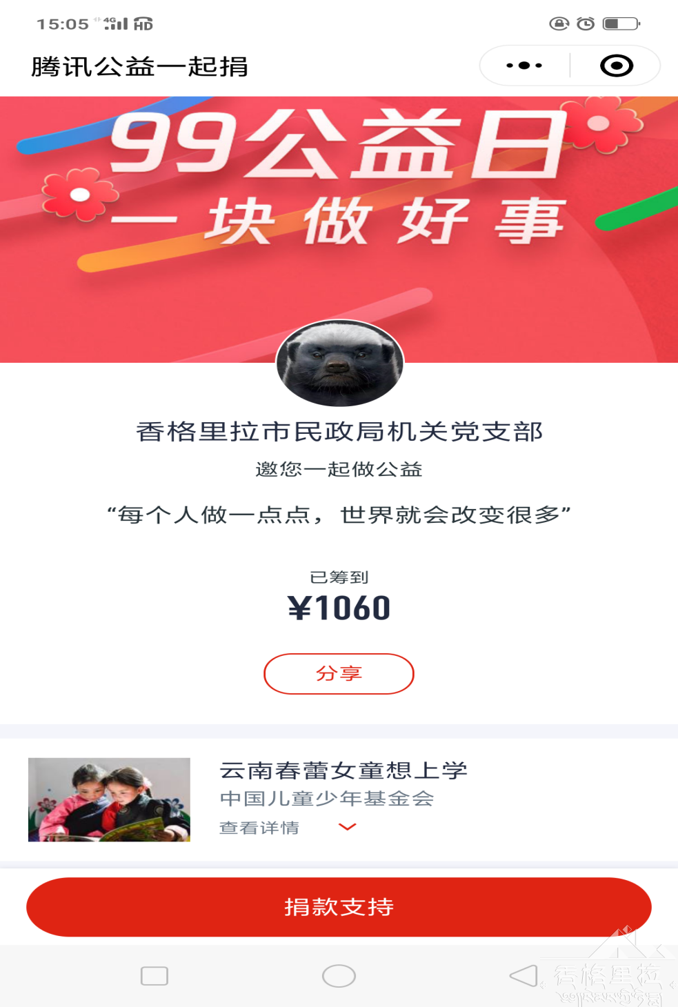 为深入推进我省做好第四个“中华慈善日”有关工作,践行社会主义核心价值观和新时代慈善文化,把“民政为民,民政爱民”的工作理念体现在实际行动上,云南省民政厅向全省民政系统广大党员干部职工发出倡议:“一块助学,党员争先”爱心捐赠活动。香格里拉市民政局积极响应号召全体党员以及机关干部职工踊跃捐款,共筹集捐款1060元助力云南春蕾女童助学教育扶贫事业,让贫困女孩通过知识改变命运,携手为家乡贫困地区的女童筹集助学善款,让每一位生于寒门的女孩,拥有通过知识改变命运、摆脱世代贫困的机会。