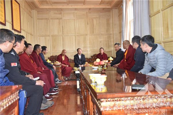 2019年9月28日上午,云南省政法委副书记茶忠旺同志在迪庆州副州长、州公安局党委书记、局长吴学著、迪庆州政法委副书记康建华、州公安局党委委员、驻局纪检组长杨文学等领导的陪同下,深入松赞林寺督导检查70周年大庆安保工作,同时召集松赞林寺民主管理委员会、松赞林景区管理局、尼旺宗派出所负责人召开座谈。