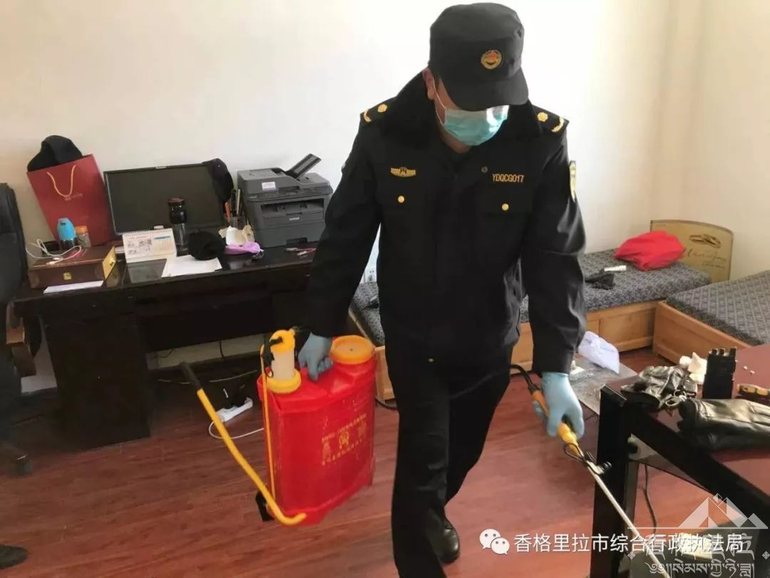 在疫情期间,对垃圾容器、停车场、办公地点、执法车辆、进出通道等进行日常清洗保洁外,每天按标准全面喷洒消毒二次,并用兑好的消毒液对物体表面进行擦拭或湿拖。
