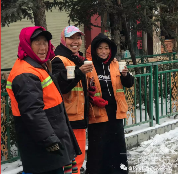 2020年1月8日早晨,这一群最可爱、最可敬的“城市美容师”按照惯例清扫着路面的积雪,连续几日的大雪天气使清扫工作较为困难,清扫到一半后只见几位工人累得气喘吁吁站在公交站台边休息,这时,香格里拉市开发投资集团有限公司董事长赵治洋同志看见这一幕,迅速召集公司职员烧好开水为工人们送去茶水,看到他们冻红的双手和脸颊,为他们递上一杯暖暖的茶水,只希望可以让他们暖暖手、休息片刻。