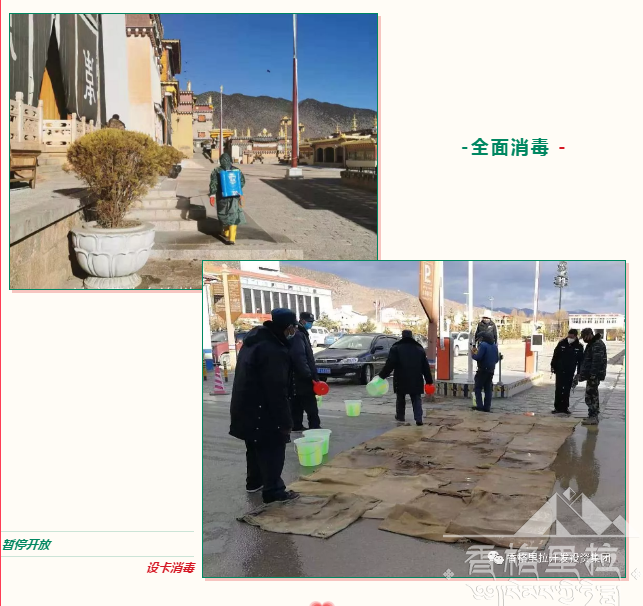 松赞林暂停营业、设卡巡防、全面消毒:为进一步加强疫情防控工作,避免因人员聚集引发交叉感染,降低疫情传播风险,松赞林景区公司自1月25日(大年初一)起暂停开放游览。因景区内除寺院外还有两个居民社区,情况较为复杂,为最大限度保障社区居民的身体健康和生命安全,公司领导主动带头,抽调人员每天早上6:30开始在保安亭、奶子河源头、吓浪塘、寺院等区域进行堵卡防控巡逻,严格按规定排查进出车辆及人员,并沿主干道进行消毒作业。其中,夏浪塘、奶子河源头每天消毒一次,门禁系统保安亭每15分钟消毒一次,景区内办公区域每三天消毒1次,消毒总面积预计为1600平方米。