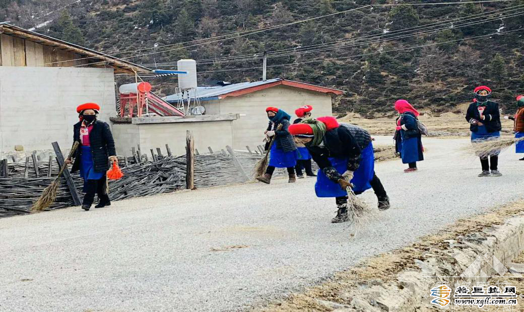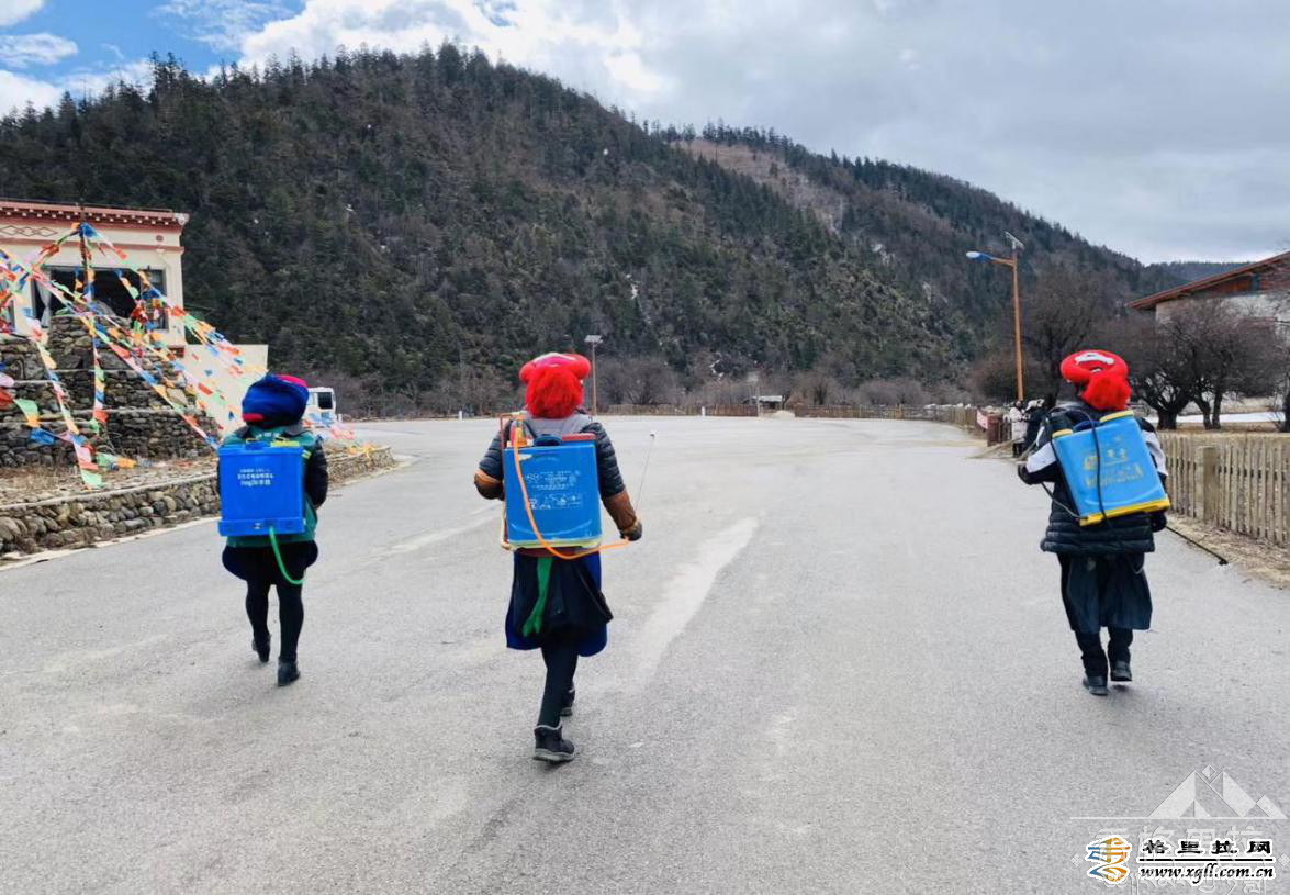 ▲红坡村妇女对村组道路进行消毒