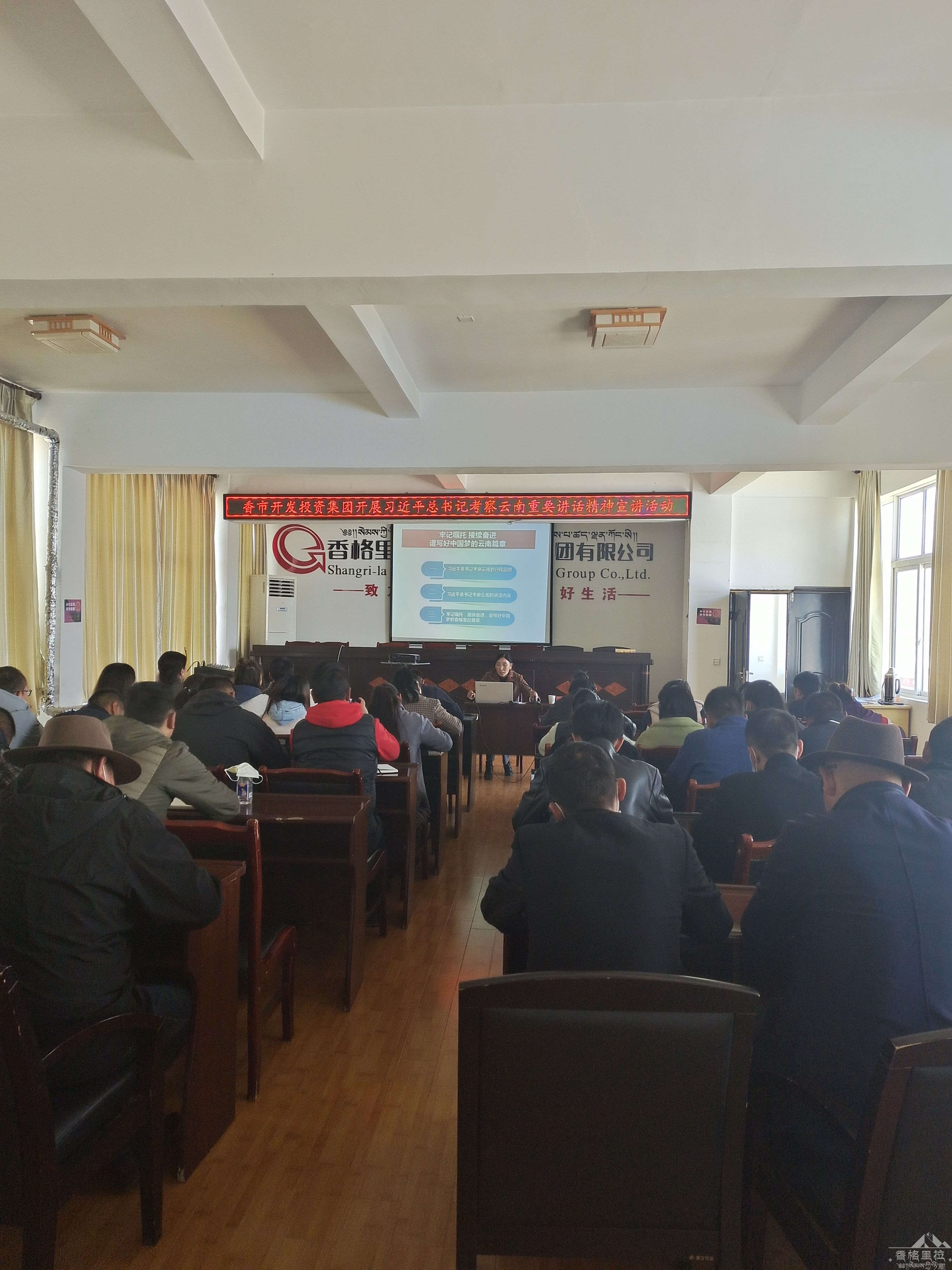 5月14日下午2:30,香格里拉市开发投资集团有限公司邀请市委党校杨丽琼老师开展习近平总书记考察云南重要讲话精神宣讲活动,公司全体员工及子公司党员参加宣讲会,会议由赵治洋同志主持。会上,杨丽琼老师从习近平总书记考察云南行程回顾、习近平总书记考察云南的讲话内容、谱写好中国梦香格里拉梦篇章三个方面给大家讲了习近平总书记考察云南重要讲话精神。