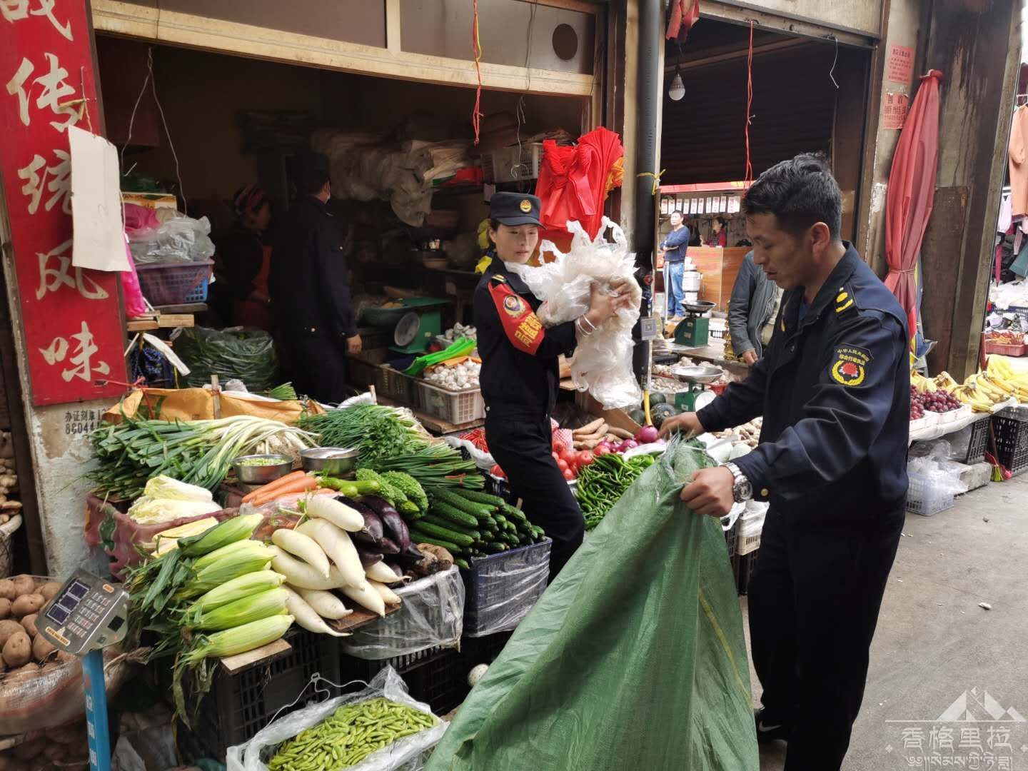 排查整治白色污染,重点对城区五个农贸市场及周边商户小贩进行“禁白”专项整治工作,全面清查收缴塑料餐饮具、塑料袋。检查过程中,对农贸市场、经营商户、零散商店等使用或销售提供一次性塑料购物袋、塑料餐具的情况进行了全面突击检查,并严格按照《迪庆藏族自治州香格里拉城市管理条例》第二十七条、第四十三条第八款,对违规生产、销售、使用的行为依法查处,共计没收一次性塑料袋20000余个。