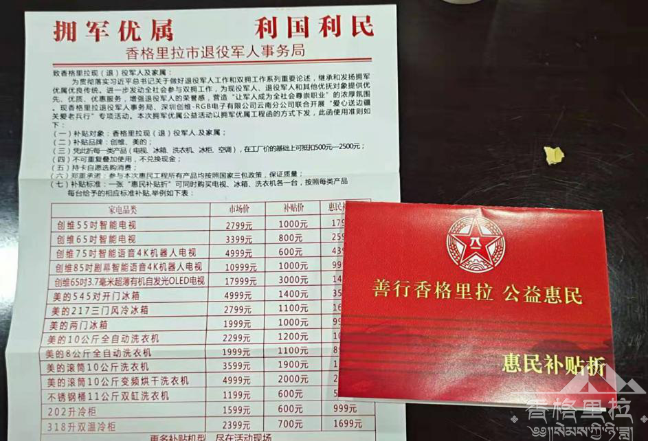 “若有战,召必回”“退伍不褪色”……是广大退役军人和优抚对象身上的标签,为扎实做好拥军优属、拥政爱民工作,切实提升站位,饮水思源,更好地保障退役军人和优抚对象生活,促进消费加快回补、有效释放消费潜力,香格里拉市退役军人事务局与创维集团云南分公司联合开展拥军优属公益专项工程。