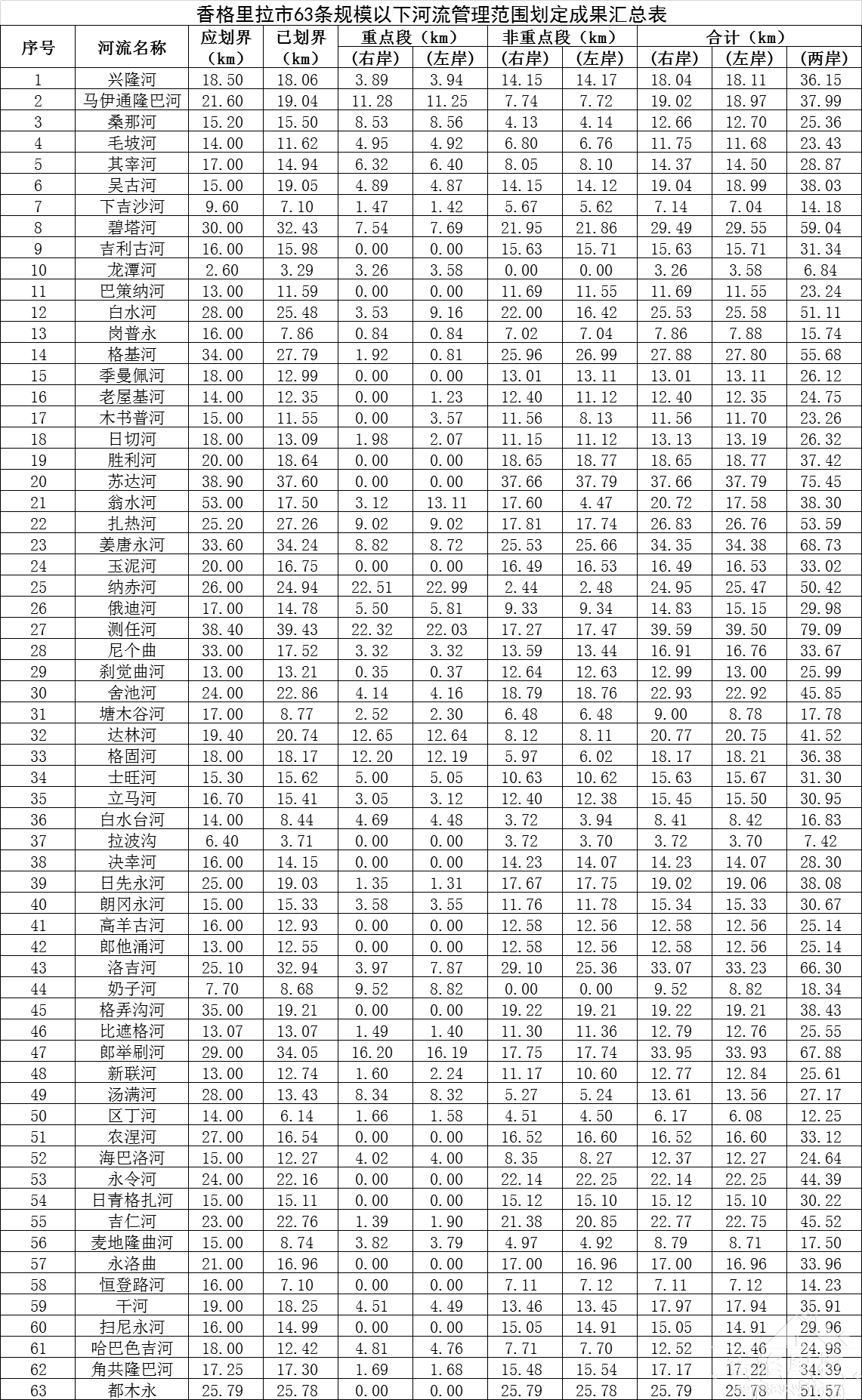 依法划定河湖管理范围,明确河湖管理边界线,是《中华人民共和国水法》、《中华人民共和国防洪法》、《中华人民共和国河道管理条例》等法律法规的强制规定,也是加强河湖管理的基础和前提,更是中央全面推行河(湖)长制的明确要求,根据《云南省水利厅关于加快推进河湖管理范围划定工作的通知》(云水河长〔2019〕2号)、《云南省河长制办公室关于加快河湖管理范围划定的督办通知》(云河长办督〔2020〕22号)等文件精神,香格里拉市水务局牵头完成了63条规模以下河流管理范围划定工作,及时征求了各乡(镇)及相关部门的意见并修改完成,63条规模以下河流管理范围划定成果于2020年12月23日通过相关专家联合审查,并上报香格里拉市第二届人民政府第77次常务会研究,同意将我市63条规模以下河流管理范围划定成果予以公示。如需查询管理范围划定成果相关信息,请到香格里拉市水务局(香格里拉市行政中心1-3-22号)或到各乡(镇)人民政府查询,联系人:龚龙,联系电话:0887-8222513。