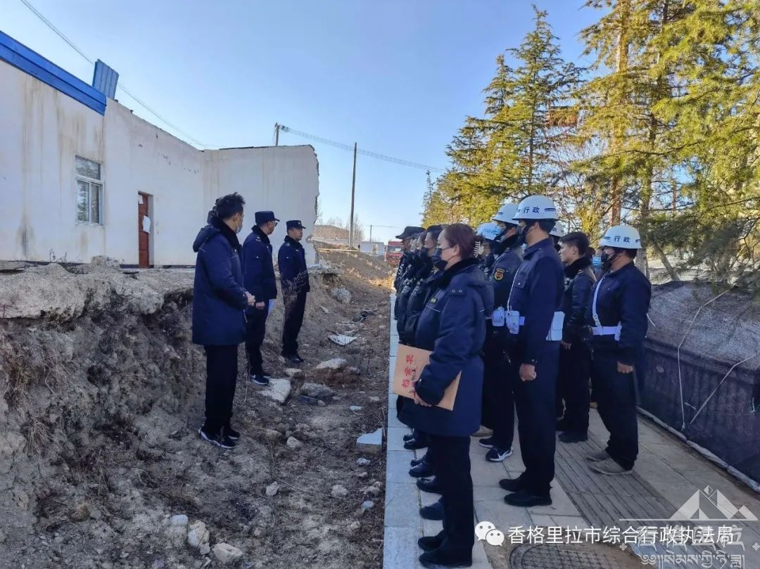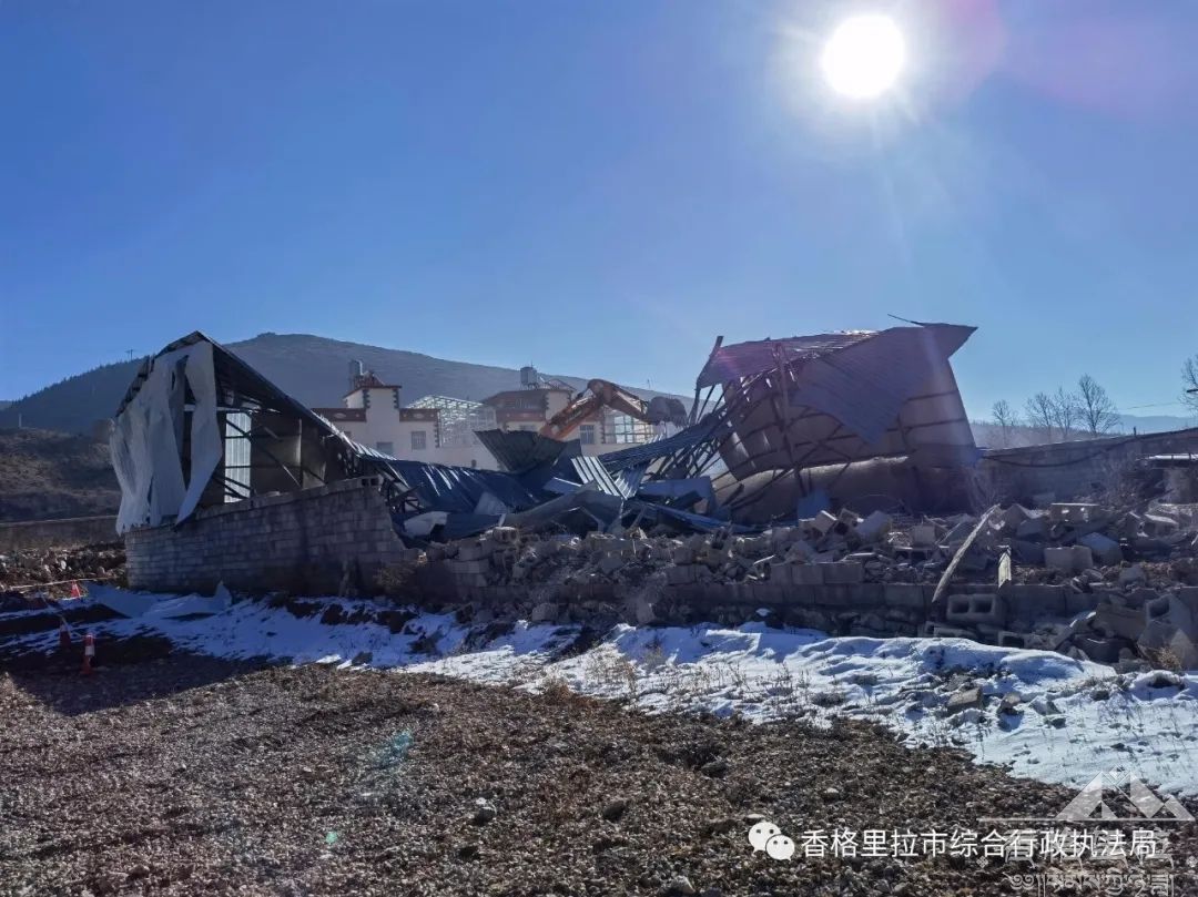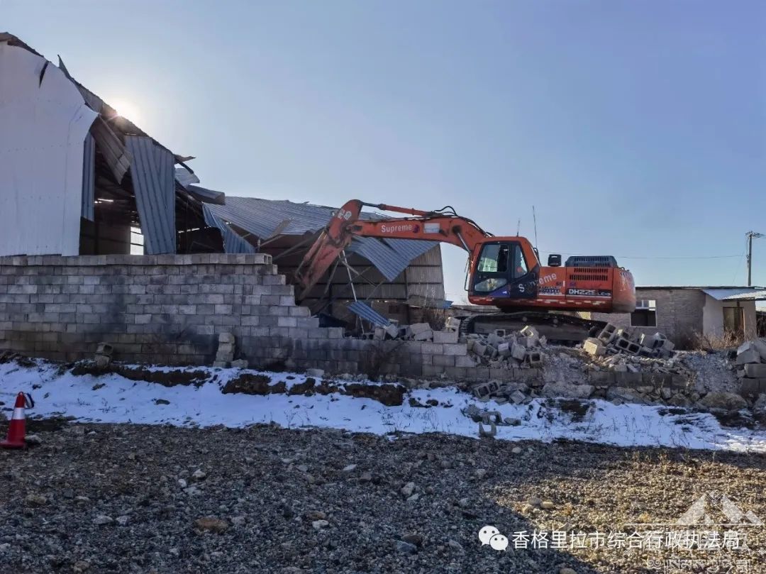 2月4日,香格里拉市综合行政执法局联合市自然资源局、司法局、城市直属交警大队、建塘镇派出所、建塘镇执法中队、建塘镇卫生院共30余人,出动挖掘机1台,对迎宾大道旁东侧一处违法建筑依法进行强制拆除。