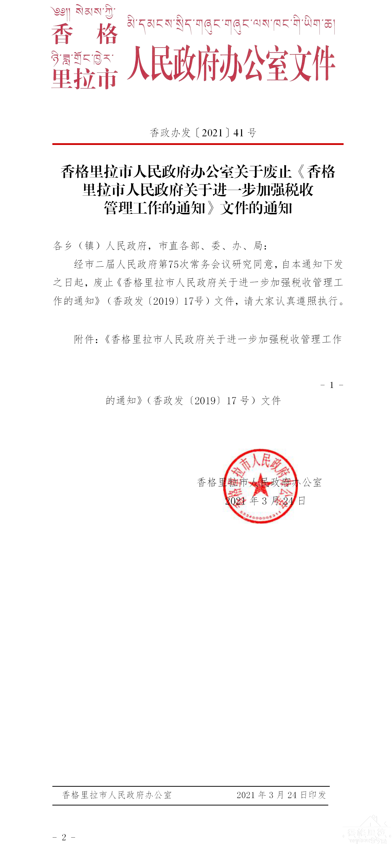 【市政府办】关于废止《香格里拉市人民政府关于进一步加强税收管理工作的通知》文件的通知