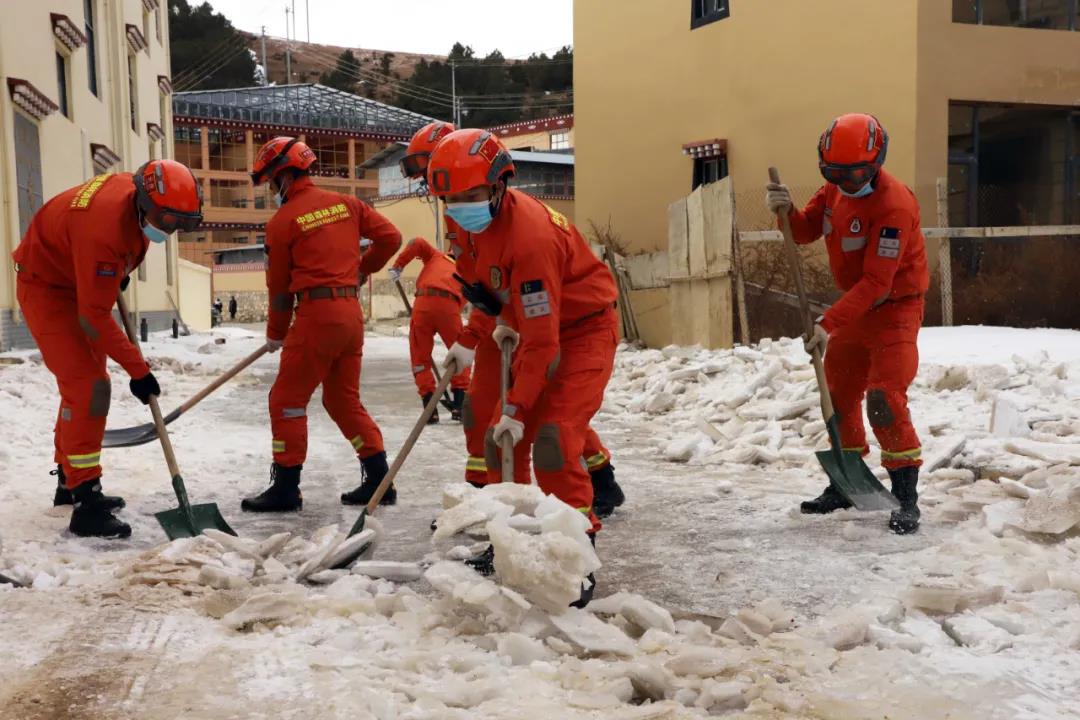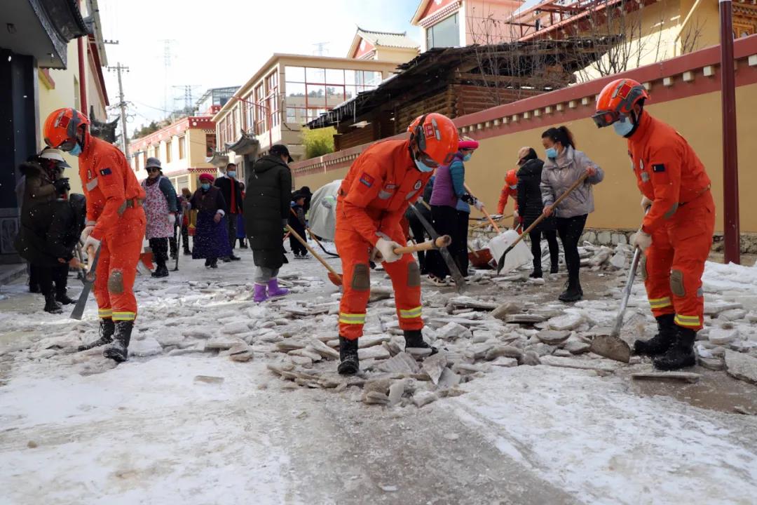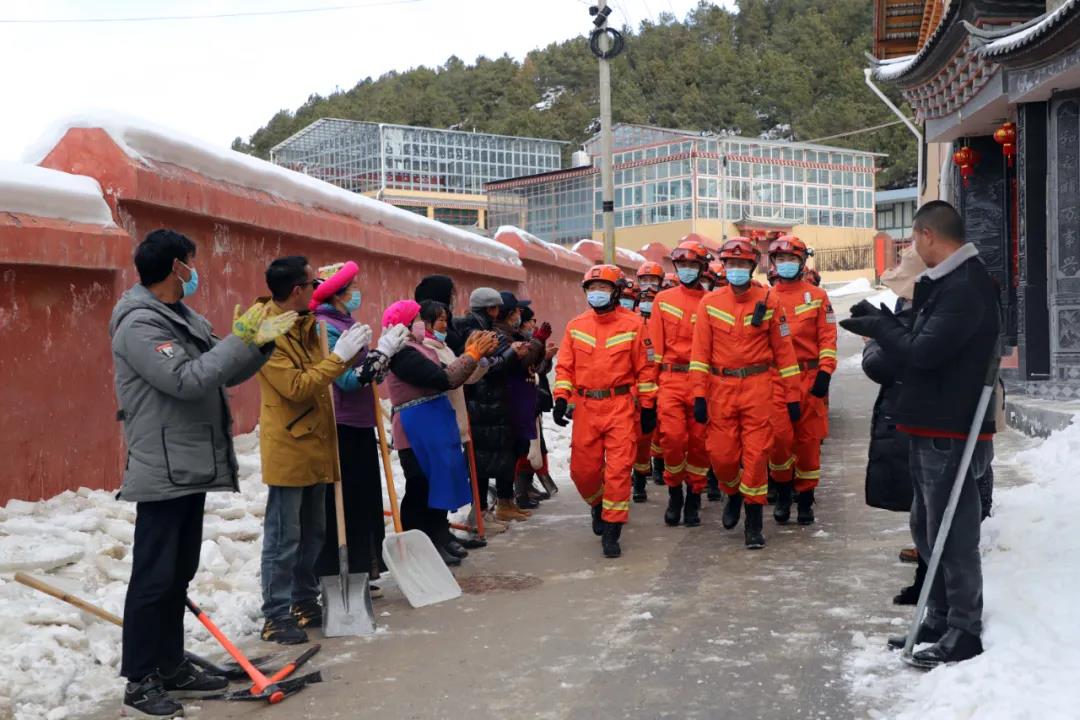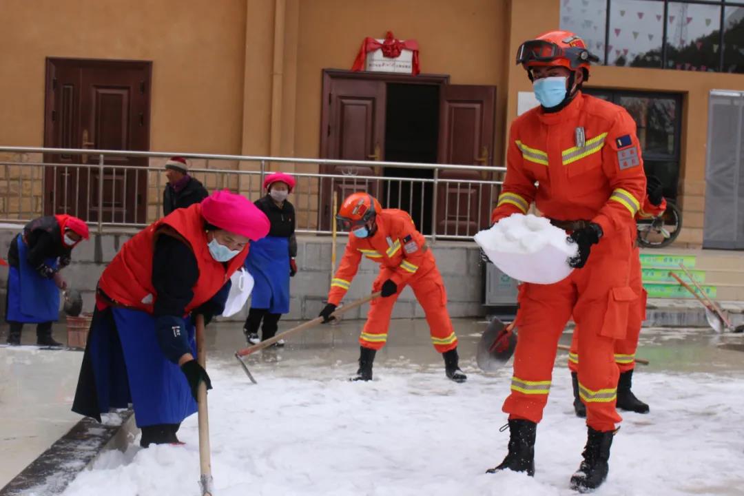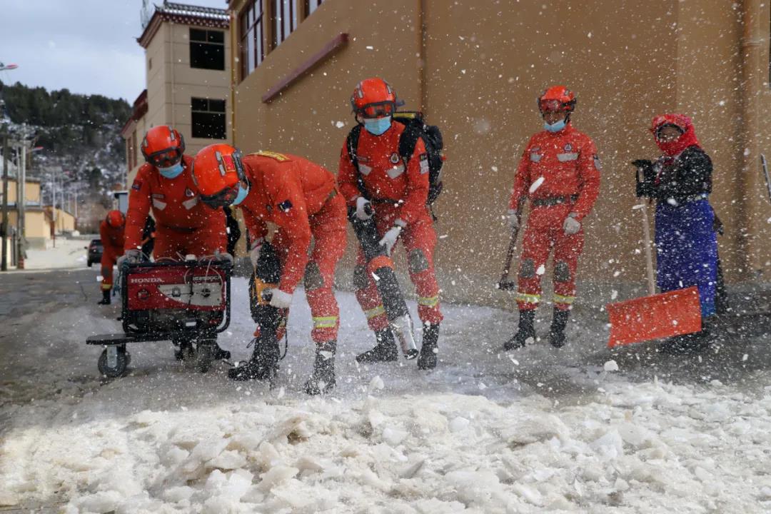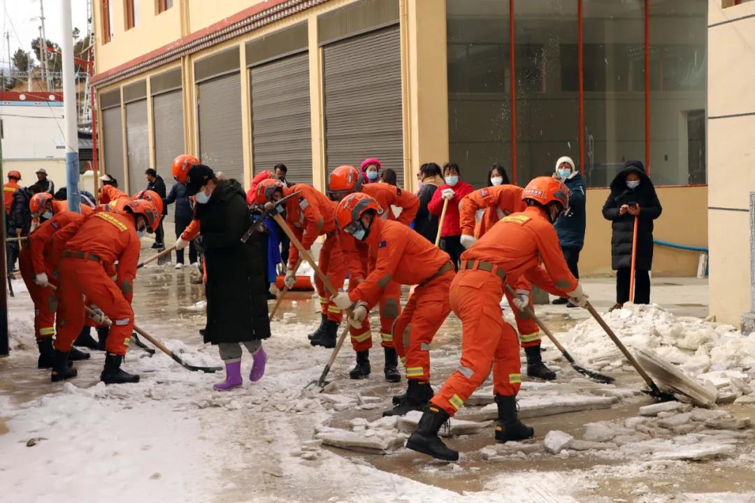 受大雪、寒潮极端天气影响,迪庆州香格里拉市建塘镇北门社区部分道路结冰超过10厘米,社区居民出行存在较大安全隐患。为及时消除安全隐患,保障道路运行畅通,2月12日下午,云南省森林消防总队迪庆大队出动76名消防救援人员到北门社区铲雪除冰。