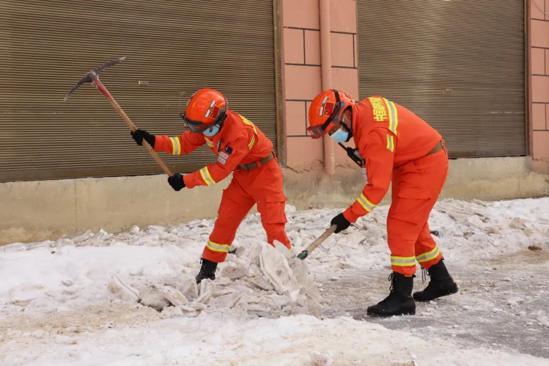 怀着亲民、爱民、便民、利民的责任意识和服务宗旨,在凛冽的寒风中消防救援人员利用铁锹、十字镐、电动破碎镐等除冰工具展开除冰作业。全体队员不畏严寒、相互配合、齐心协力,忙碌的身影筑成一道美丽的风景线。