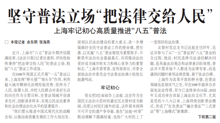 近日,上海市“八五”普法中期评估圆满结束。记者注意到,评估组始终秉持“把法律交给人民”的普法立场,检验“八五”普法工作成效。