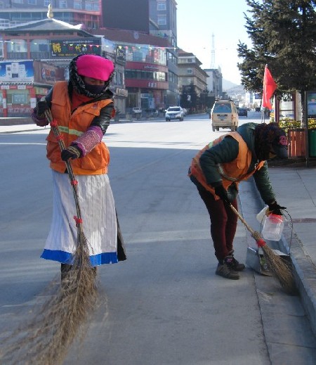 环卫工人给追和孙诺拉姆负责的路段在长征大道上,大年三十早上,当居民们还沉浸在睡梦中时,她俩就已扛起扫帚,拿着铲子走出家门开始清扫垃圾了。给追告诉记者,春节前,商店老板进货多,老百姓买年货的也多,留下来的垃圾也格外多,清扫的压力很大。孙诺拉姆说,为了不影响过三十,她俩都在出门前把晚饭要吃的肉炖在炉子上,其他的小菜只有回到家再做了。她说:“春节期间,我们每天都要早早地把路面上的垃圾收拾好,街道干净了,大家才有好心情过新年。”