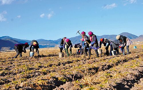 村民们五个一伙、八个一群,有的用锄头连根挖起、有的采摘玛咖根茎、有的把收获的玛咖打包上车,大家都很忙碌,但是悠扬的歌声和不时传出的笑声却不绝于耳。趁着劳作间歇的休息时间,布伦村的知诗央初与玛咖基地的负责人算起了她家的收入“一共出租了4亩地,每亩760元,再加上两个劳动力在玛咖基地里一共打了100多天的零工,每个工收入100元,盘算下来仅玛咖种植公司就要付给她家近2万元”。央初还说,等这几天基地的农活干完后,她要进城买一台大的液晶电视,现在家里的彩电感觉有些小了。