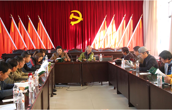 图为田园公司方在大具乡人民政府会议室讲解种油橄榄植技术手册