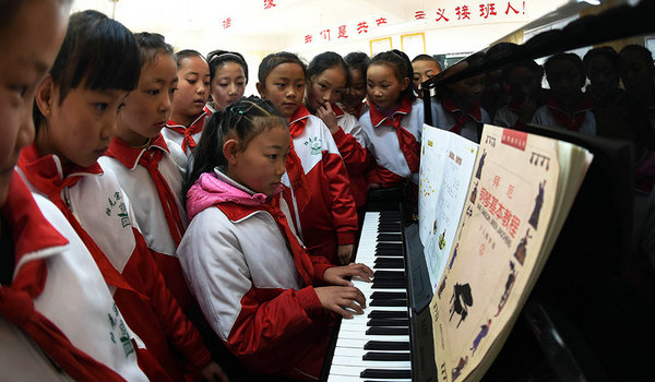 3月27日,独克宗小学的学生在音乐兴趣班上观看一名藏族同学弹钢琴。