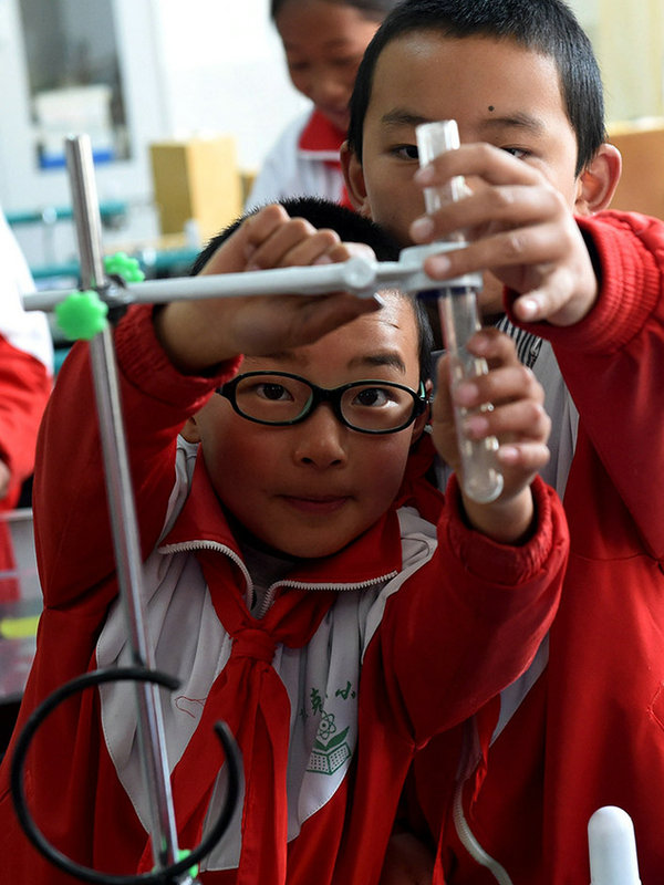 3月27日,独克宗小学的两名藏族女学生在科学实验课上。