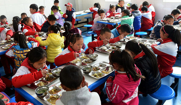 3月27日,独克宗小学的学生在食堂里吃免费午餐。