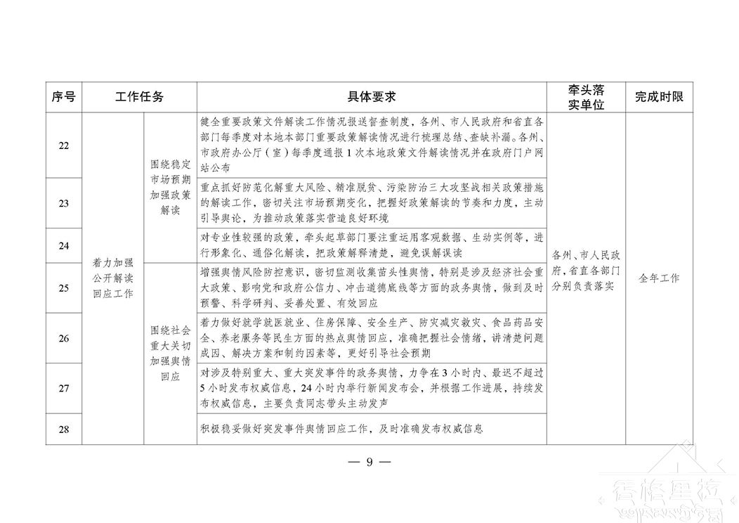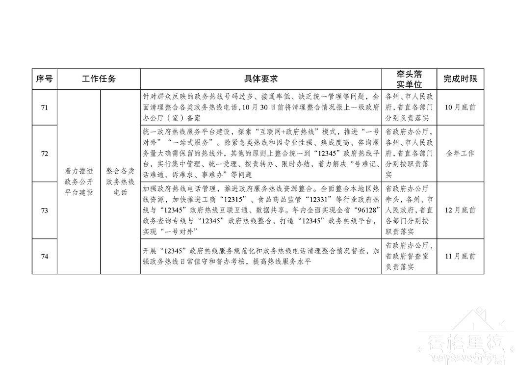各级政府及部门办公厅(室)要切实承担起本地本部门政务公开工作的组织推动、统筹协调、督促检查主体责任,按照“年布局、季统筹、月计划、周安排、日对照”工作思路,坚持事前谋划、事中督导、事后总结,有力有序推进本地本部门政务公开各项工作;要对照分工方案将责任落实到具体部门、落实到具体责任人。有关牵头单位要按照“谁牵头负责、谁组织落实”的原则,不断强化对本系统本行业政务公开工作的指导、督促和检查,加强上下联动、横向协调,增强合力;要紧盯国家政务公开最新部署,依法依规推进,立足自身职能加强调查研究和统筹协调,及时掌握进展情况,及时协调解决遇到的困难和问题。有关责任单位要根据职能分工,进一步细化分解任务,确保各项目标任务按时完成。同一事项由多个部门共同完成的,牵头部门要做好统筹协调,形成齐抓共管、共同推进的工作格局,防止出现工作遗漏。