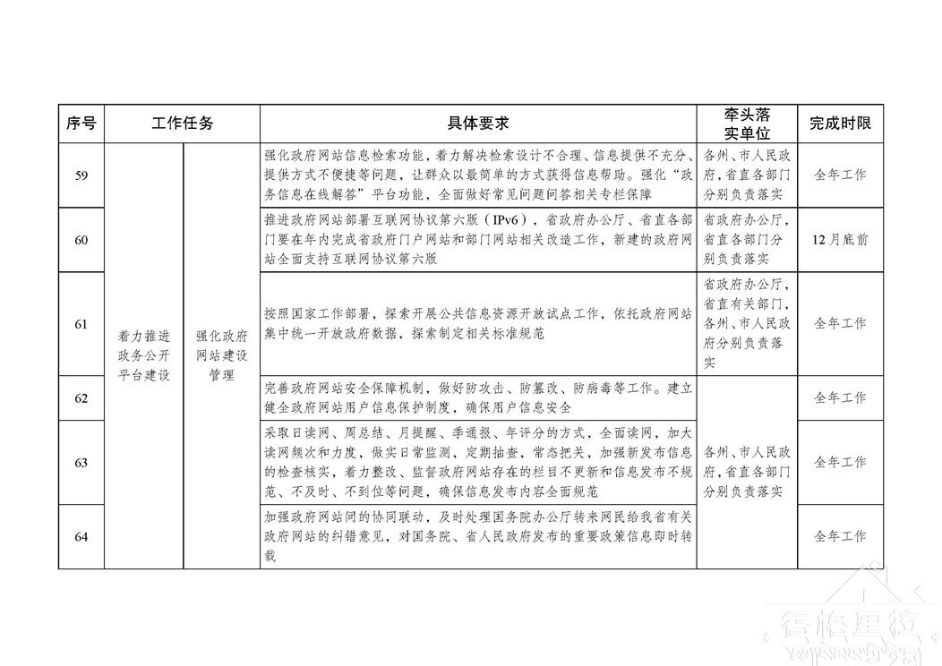 推进政务公开是全面贯彻党的十九大和十九届二中、三中全会精神,促进法治政府、创新政府、廉洁政府和服务型政府建设的重要举措和必然要求,是各级政府及其部门义不容辞的责任。各地各部门要以习近平新时代中国特色社会主义思想为指引,深入贯彻落实党中央、国务院和省委、省政府重要决策部署,切实将全面推进政务公开工作列入重要议事日程,真正把政务公开工作与本地本部门的中心工作同研究、同部署、同考核、同推进,着力加强公开解读回应工作,着力提升政务服务工作实效,着力强化公开平台建设管理,着力推进政务公开制度化规范化,确保年度政务公开各项工作任务落实到位。各地各部门主要负责同志每年至少听取1次政务公开工作汇报,研究部署推进工作;确定1位负责同志分管政务公开工作,列入工作分工并对外公布。要全面加强政务公开工作力量配置,各州、市人民政府要在办公厅(室)完善专门工作机构,省直各部门要明确工作承担机构,加快配齐配强专职工作人员。对年内仍未建立专门工作机构的州、市和未明确工作承担机构的省直部门,在政务公开年度综合考评中实行“一票否决”。
