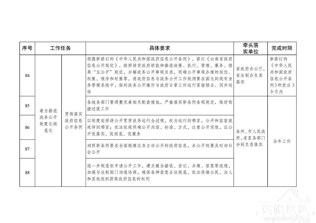 《云南省贯彻落实国务院办公厅2018年政务公开工作要点分工方案》(以下简称分工方案)已经省人民政府同意,现印发给你们,并提出以下要求,请认真贯彻执行。
