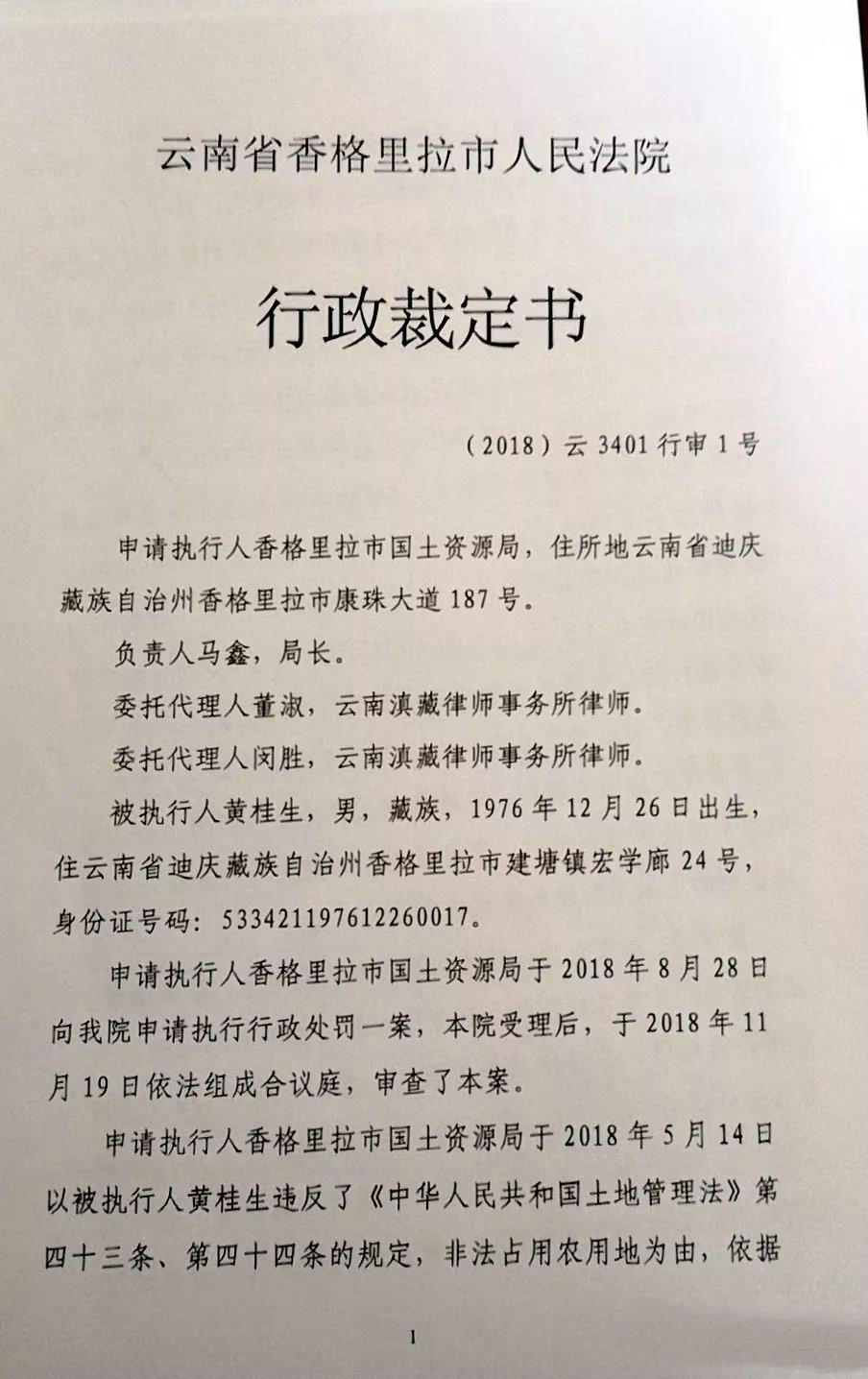 据悉,香格里拉市第一轮土地整治中依法査处的德通驾校黄桂生非法占用农用地一案,2018年1月18日香格里拉市人民法院依法作出了刑事判决,2018年5月14日香格里拉市国土资源局依法作出《行政处罚决定书》,要求黄桂生拆除在非法占用士地上的建筑物和其他设施,黄桂生迟迟不履行处罚決定。2018年8月28日,香格里拉市国土资源局依法向香格里拉市人民法院申请行政强制执行,2018年11月20日香格里拉市人民法院依法作出(2018)云3401行审1号《行政裁定书》,准予强制执行黄桂生在非法占用的土地上新建的建筑物和其他设施。