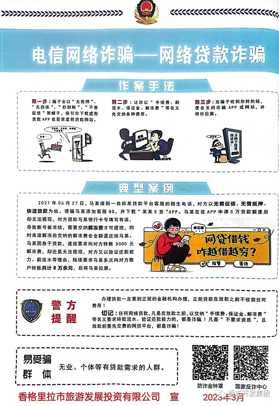 3月7日下午,公司全体员工分别到月光广场、和谐塔中塔景区,发放电信网络诈骗—网络贷款诈骗宣传单,在发放过程中向群众详细介绍了当下网络贷款的作案手法和一些上当受骗的典型案例,让市民们进一步增强了“网络贷款是陷阱,请你守住钱袋子”的防骗意识,并在宣传过程中提醒和帮助群众下载防诈金钟罩。此次活动共计发放反诈宣传单500余份。