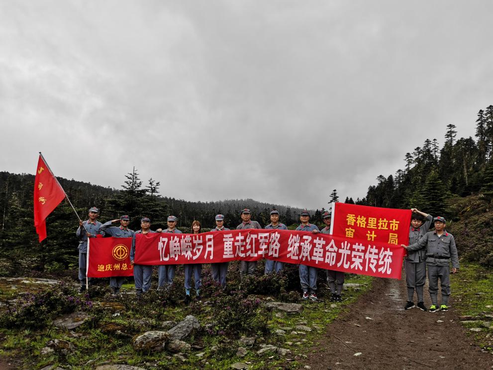 忆岁月·重走长征路,6月15日上午香格里拉市审计局党支部和迪庆州总工会党支部全体党员追寻着当年红军留下的足迹重走了红军长征走过的道路。“一步步我走在这雪域高原,部位风霜雪雨,不畏艰难.......”边走边唱《雪域审计人》歌声回荡在山涧,工作和生活都体现了高原审计人的坚韧和不畏艰难。