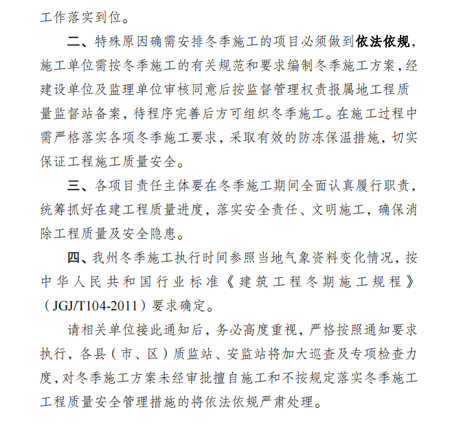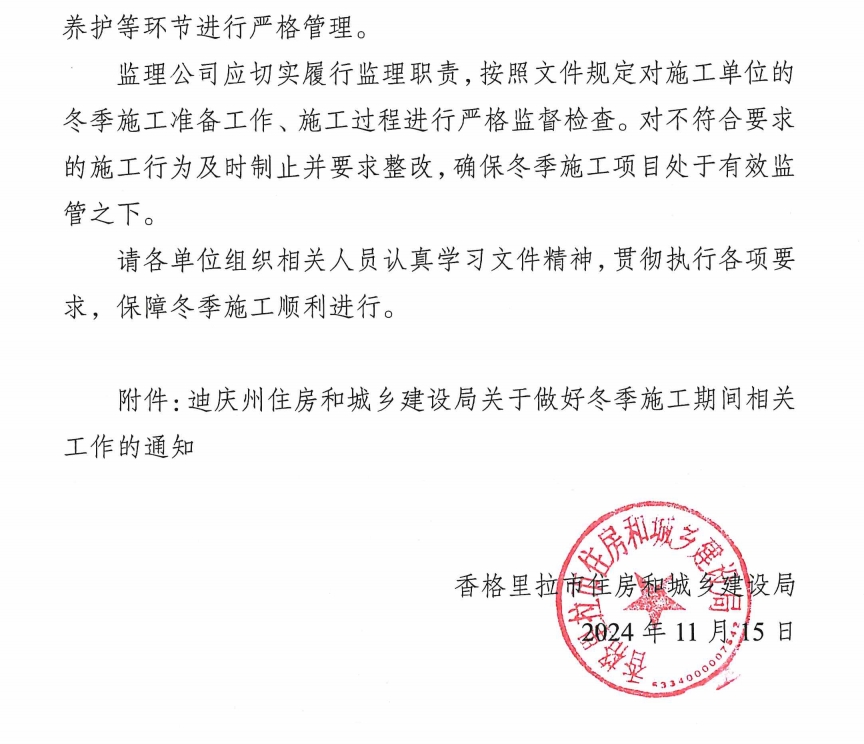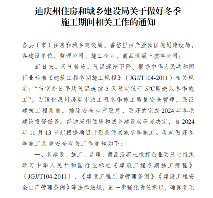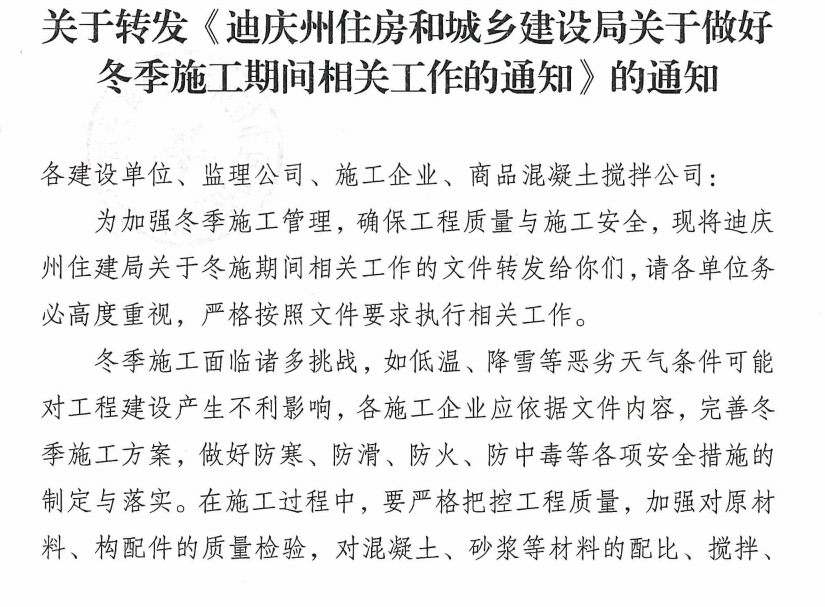 关于转发《迪庆州住房和城乡建设局关于做好冬季施工期间相关工作的通知》的通知