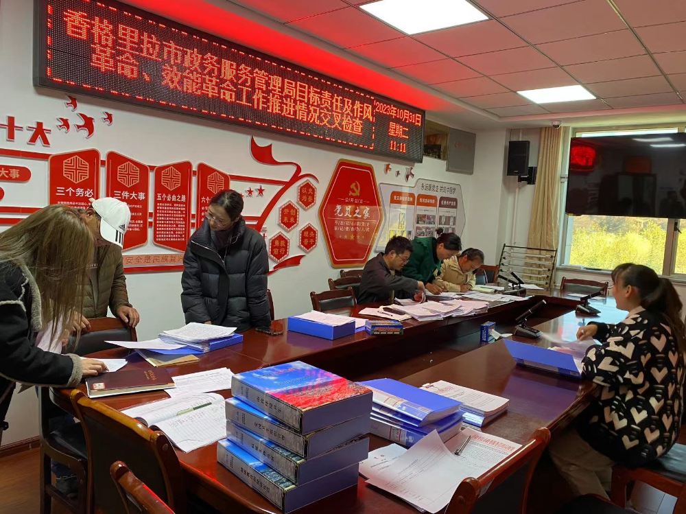 为了圆满完成我局2023年目标督查管理工作及不断推进作风革命、效能革命工作,进一步加强香格里拉市政务服务管理局各中心、各股室的目标责任管理,强化全局干部职工目标责任制的意识,切实转变工作作风,提高工作质量和办事效率,确保全面完成2023年度主要工作目标任务,经领导班子讨论,成立了检查组,下发了《香格里拉市政务服务管理局关于目标责任及作风革命、效能革命工作推进情况交叉检查工作方案》,在10月31日上午开展了交叉检查。